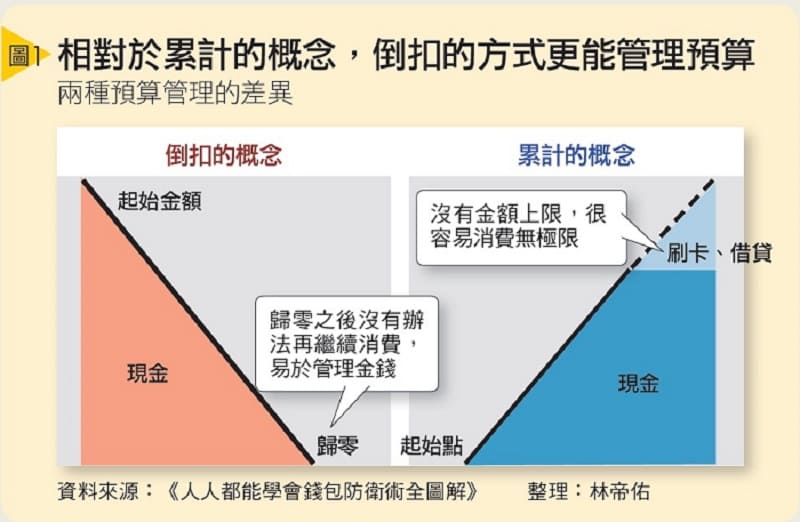 若採用累計的概念來管理金流,因為沒有上限,現金花完還能刷卡,卡刷爆了,再利用貸款等方式消費,所以很容易讓自己消費無極限(詳見圖1)。