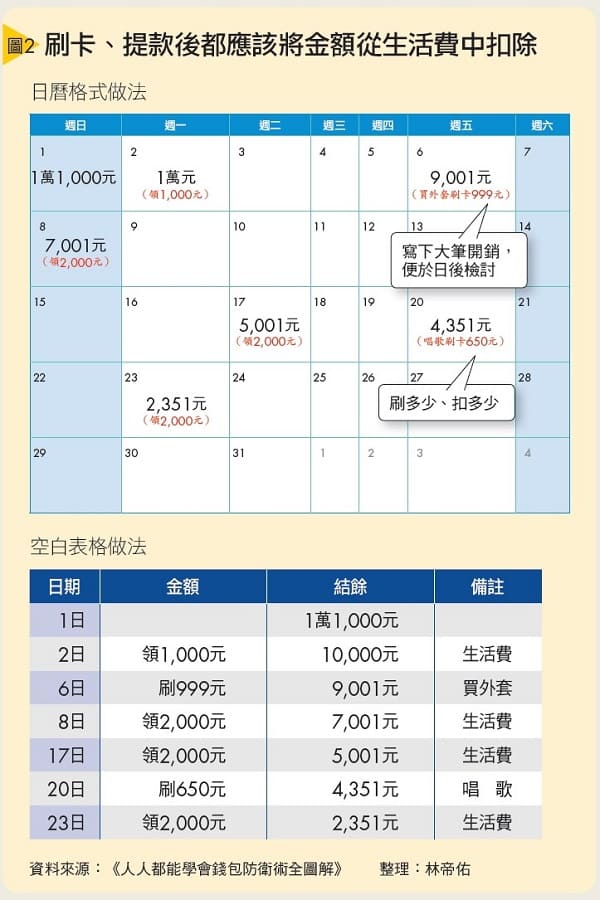 至於該如何設定倒扣的起始金額呢?一樣仰賴於初期的流水帳,知道自己每個月扣除掉房租、儲蓄等固定要預留的部分,其餘的生活開銷是多少。舉例來說,透過流水帳,你知道每個月的生活費約1萬元。
