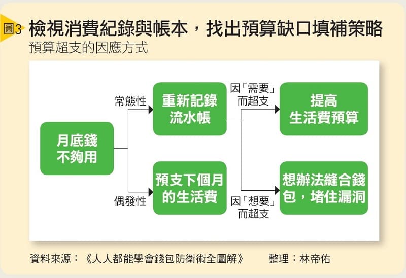 還沒有到月底,生活費就所剩無幾了,該怎麼辦?此時你要先釐清這是常態性還是偶發性?如是常態性事件,也就是連續好幾個月都發生生活費不夠用的狀況,建議重新記錄流水帳,看看是哪邊的消費出現漏洞?如果這個漏洞是「需要」而不是「想要」,就可適時提高每個月的起始金額。但若是偶發性事件,千萬別靠吃不健康的食物度日,你還是可領錢出來花用,不過,若領出來1,000元,下個月的起始金額就要預先扣掉,從1萬1,000元變成1萬元(詳見圖3)。(本文摘自第3篇)