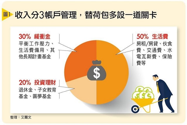 概念非常簡單,只要準備3個以上的帳戶,然後在領到薪水同時,就把錢分拆成50%、20%、30%等3種金額,分別存放到不同的帳戶裡(存放地方可以是銀行帳戶、信封袋或存錢筒)。其中50%是用作必要生活費,20%是用作實現財務目標的投資理財,剩下的30%則為緩衝金。
