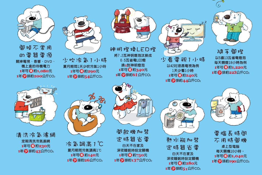 當然還有很其他方式也能節約能源,以下用圖示來分享給大家!在節能的路上,不只能省下自己的荷包,也能減少排放二氧化碳。讓我們一起守護這顆大地球!